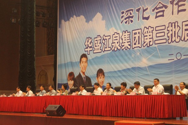 2013年6月7日華盛江泉集團(tuán)第三批后備人才培訓(xùn)班開班典禮在江泉城大酒店隆重舉行。華盛江泉城多功能廳人才薈萃,激情閃爍。出席開班典禮儀式的領(lǐng)導(dǎo)有:省人大教科文衛(wèi)委員會副主任委員朱紹陽,臨沂大學(xué)黨委書記丁鳳云,羅莊區(qū)委副書記、區(qū)長趙曉輝,羅莊區(qū)委常委、副區(qū)長張玉軍,羅莊區(qū)人大副主任趙日坤,臨沂大學(xué)商學(xué)院黨委書記曹光杰,院長許汝貞,博士刁玉柱,沈泉莊社區(qū)黨委書記、居委會主任、華盛江泉集團(tuán)副董事長王文濤,沈泉莊黨委副書記、華盛江泉集團(tuán)總經(jīng)理高洪路,沈泉莊黨委副書記、華盛江泉集團(tuán)副總經(jīng)理王廷寶以及集團(tuán)所有高管、各單位管理人員和后備人才等。同時邀請了臨沂日報社、臨沂電視臺、臨沂大學(xué)及華盛江泉集團(tuán)有關(guān)新聞媒體對本次典禮進(jìn)行了實(shí)時報道。