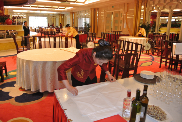 比賽現(xiàn)場(chǎng)氣氛緊張而激烈,選手著整齊的制服,以抽簽的形式確定比賽的先后順序,檢查完擺臺(tái)用的餐具用品后,比賽正式開始。中餐擺臺(tái)主要分口布折花、鋪臺(tái)布、上轉(zhuǎn)盤、擺放餐具、倒酒、分餐等部分,參賽選手四個(gè)人為一組進(jìn)行了比賽。現(xiàn)場(chǎng)評(píng)委認(rèn)真嚴(yán)肅,參賽選手沉著應(yīng)戰(zhàn),集團(tuán)公司全程現(xiàn)場(chǎng)監(jiān)督,整場(chǎng)比賽在公平、公正、公開的氛圍下圓滿結(jié)束。